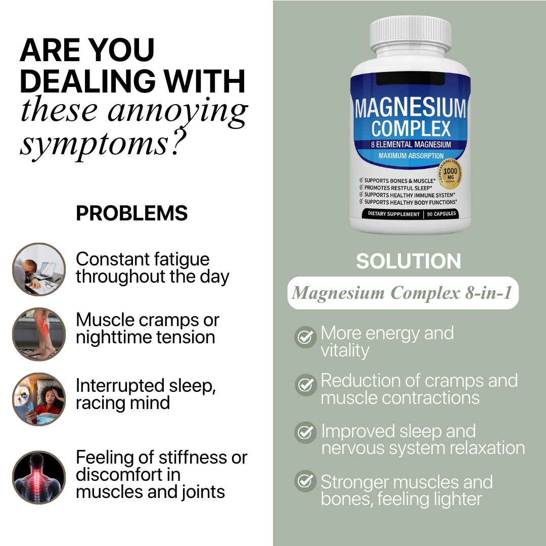 Your brain, heart, metabolism, emotions, and biological age all depend on magnesium to repair overnight. After 34, your body absorbs less while stress burns through more. When levels drop, all five systems degrade at once — no matter how well you eat, exercise, or manage your routine. Magnesium 8-in-1 delivers eight targeted forms to restore what your body can no longer get on its own.