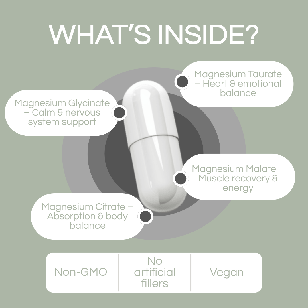 Glycinate is excellent for calming the brain — one system out of five. Your muscles need malate. Your heart needs taurate. Your cortisol regulation needs citrate. Single-form magnesium is like one key for five different locks. Eight forms means every system that depends on magnesium gets the specific form it can actually use.